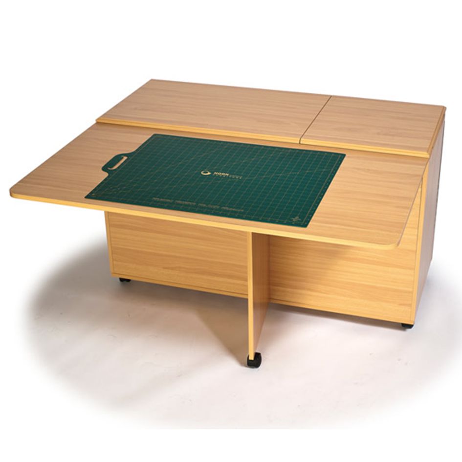Horn 8090 sewing cabinet 78x64x30inh 301lb, thread rack, electric lift platform, 31x15.5in cutout for brother luminaire and baby lock solaris machines.